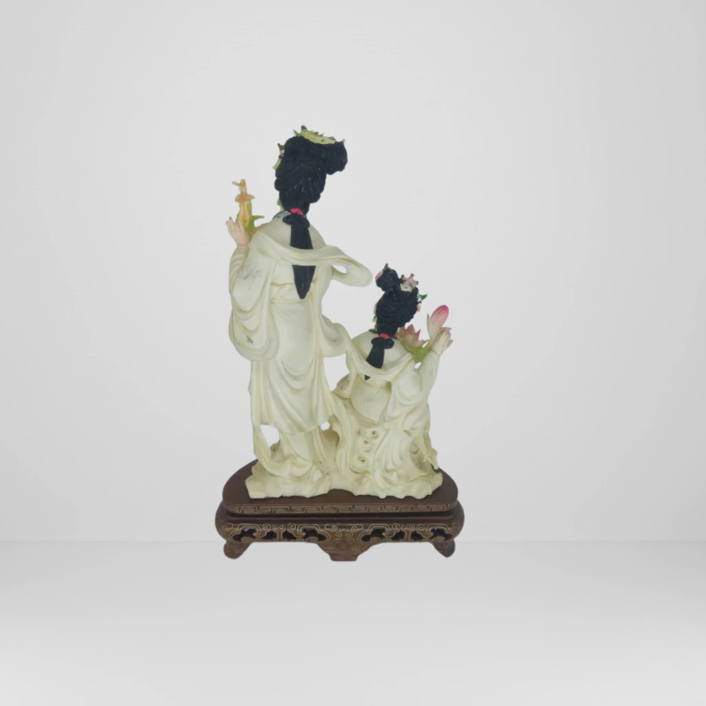 Escultura oriental representando mãe e filha gueixas, confeccionada em resina com belíssimo trabalho de detalhes e base em madeira. A peça exala delicadeza e simbolismo, evocando harmonia, tradição e vínculo familiar. Ideal para ambientes que valorizam cultura, estética asiática e composições com significado.